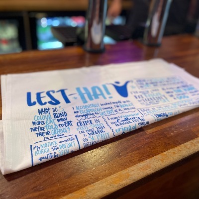 Barry D Bulsara’s wonderful ‘Lest-Ha!’ print is now available on a tea towel. The design features jokes from comedians who regularly perform at the annual Leicester Comedy Festival.